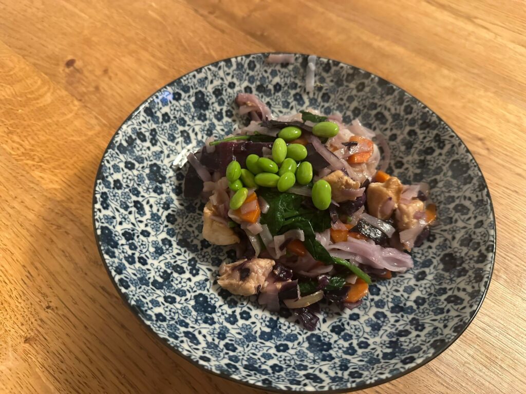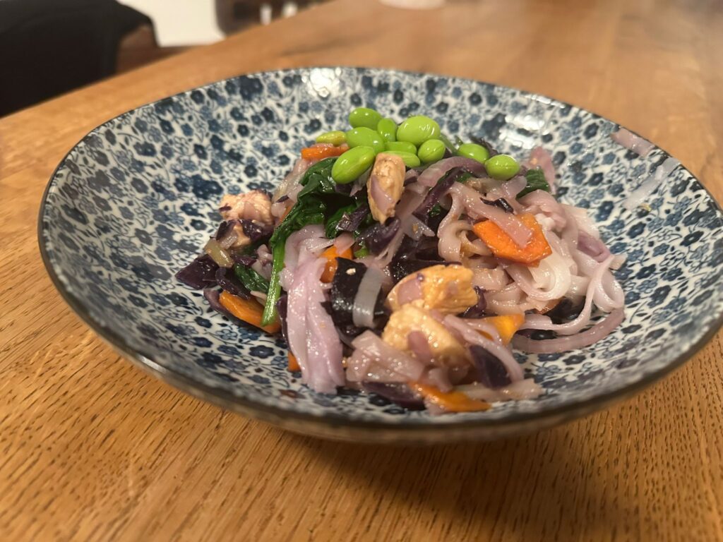 Čínské nudle s kuřecím masem a zeleninou servírujeme s edamame boby.