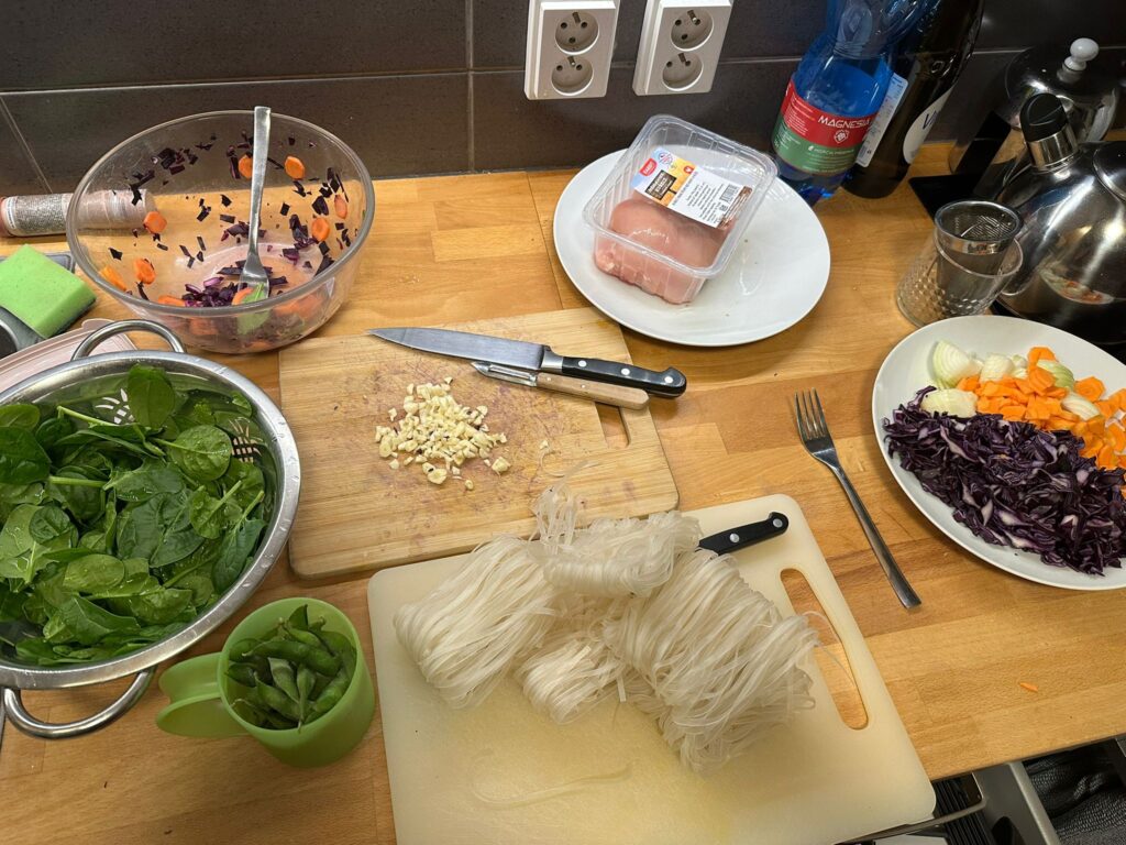 Mezitím, co se nám dělají kuřecí kousky i zelenina, si v rendlíku přivedeme k varu dostatečné množství vody a pak do ní namočíme rýžové nudle. Plotnu ale vypneme.