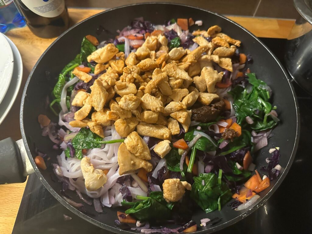 Po zhruba pěti až deseti minutách bychom měli mít hotovou jak zeleninu, tak i kuře. Nyní ve velké pánvi smícháme zeleninu s kuřetem a scezenými nudlemi. Přidáme oprané lístky baby špenátu, dvě lžíce shiitake pesta a trošku sojovky a opatrně mícháme, aby se nám nudle nepotrhaly.