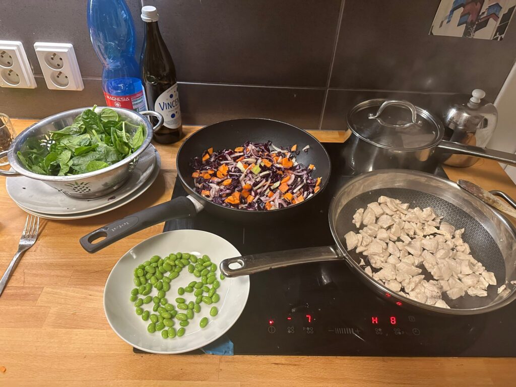 Na druhé pánvi si na troše oleje začneme opékat kuřecí prsa, která jsme nakrájeli na malé kousky. Ideálně by jich v pánvi nemělo být příliš, aby se nezačaly vařit. Raději chceme kousky dozlatova opečené. Když jsou hotové, dochutíme je sojovkou a případně i solí.