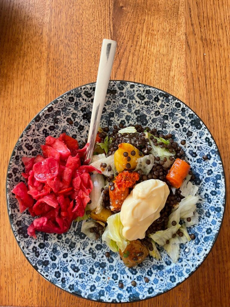Upečenou zeleninu smícháme s čočkou a natrhaným salátem a dochutíme solí a pepřem. Podáváme dle chuti s kimchi a majonézou.