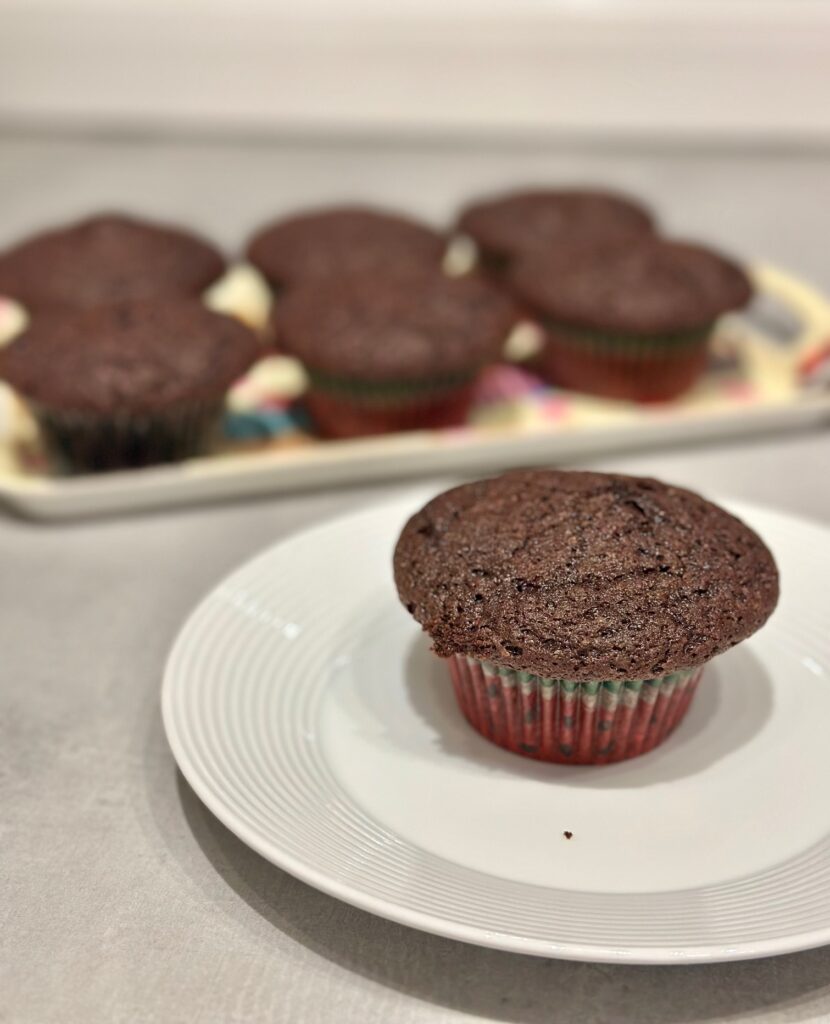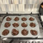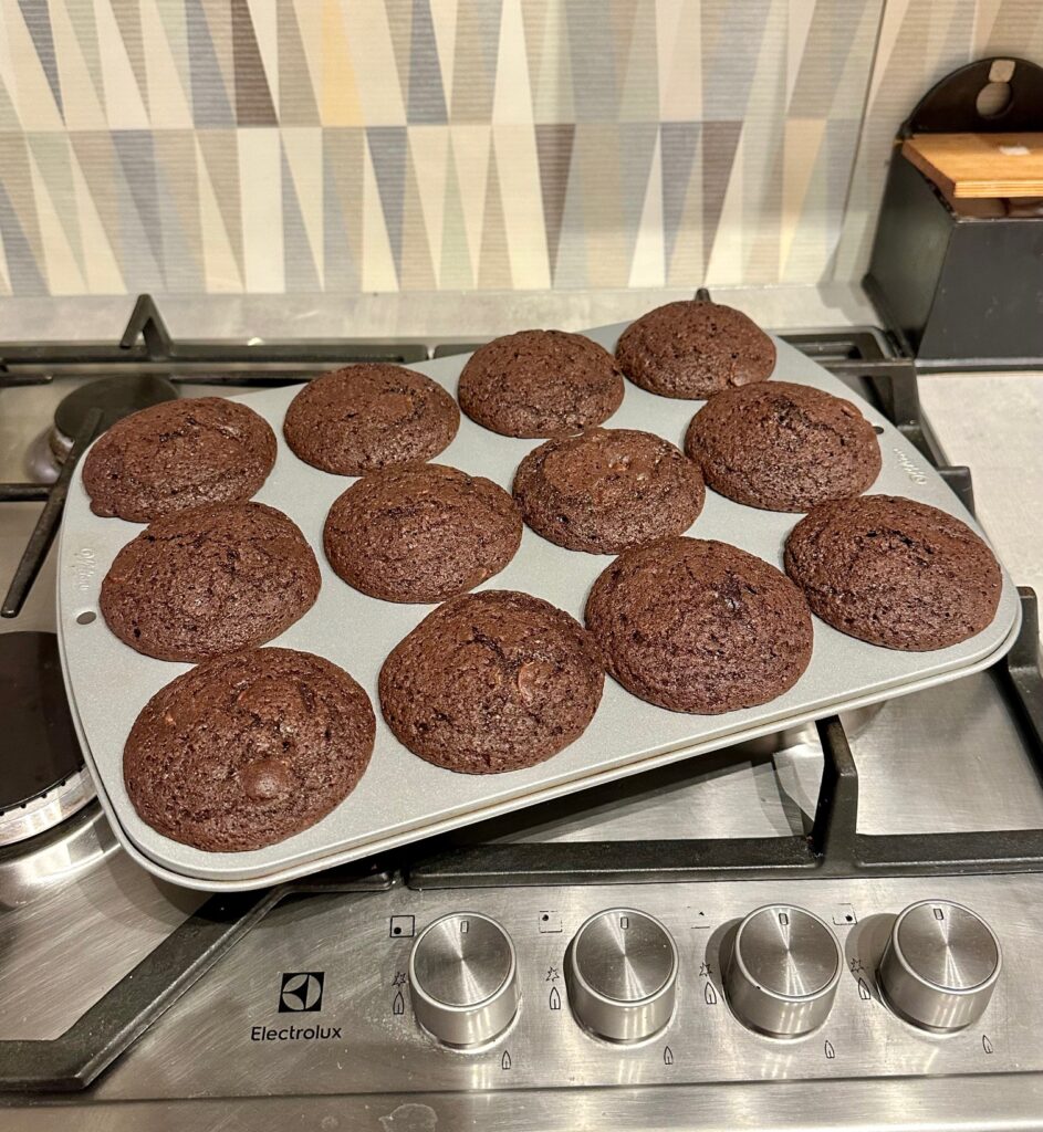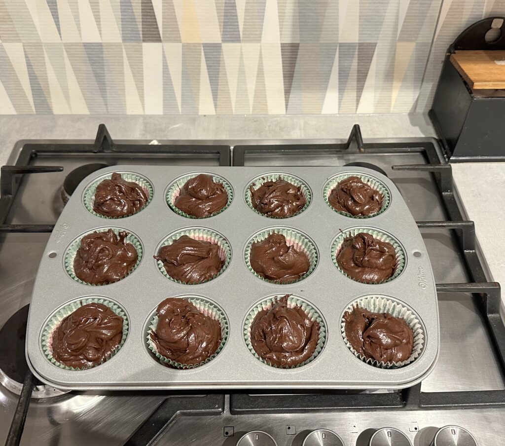 Formu na muffiny vyložíme papírovými košíčky, naplníme těstem a pečeme na 175°C zhruba 20 minut.