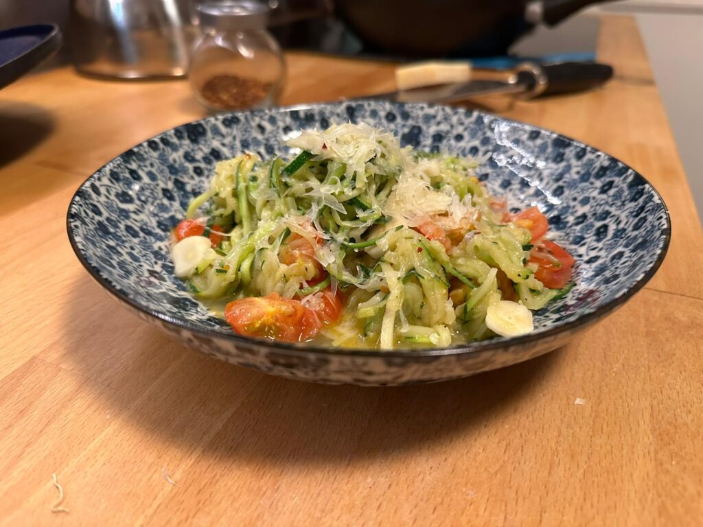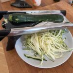 Cuketu nemusíme loupat a jen ji pomocí speciální škrabky, mandolíny nebo spiralizéru nakrájíme na špagety. Jde to i nožem, ale výsledek není tak dobrý a ještě stojí víc úsilí.