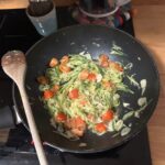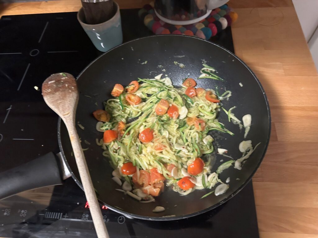 Cuketové špagety opékáme na pánvi na rozehřátém olivovém oleji spolu s plátky česneku. Trvá to asi pět minut, dokud není cuketa měkčí, ale stále křupavá.