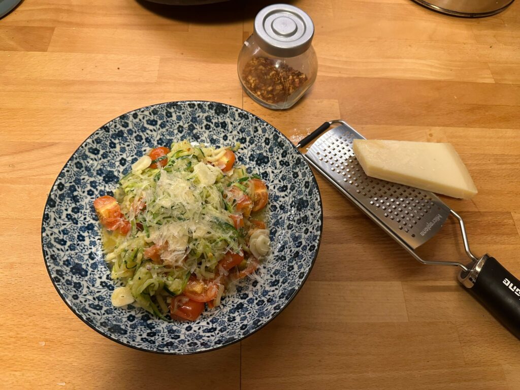Cuketové špagety osolíme, opepříme a přidáme chilli. Podáváme s parmazánem.