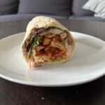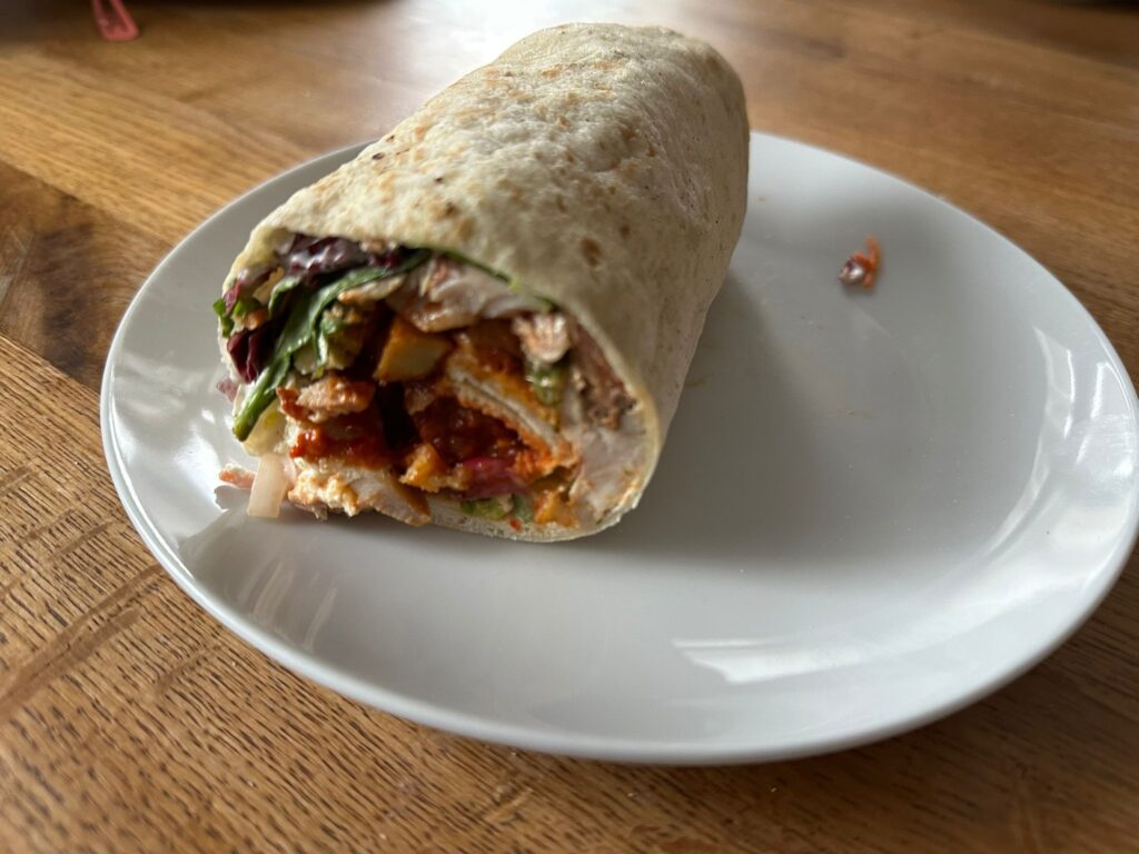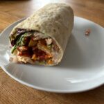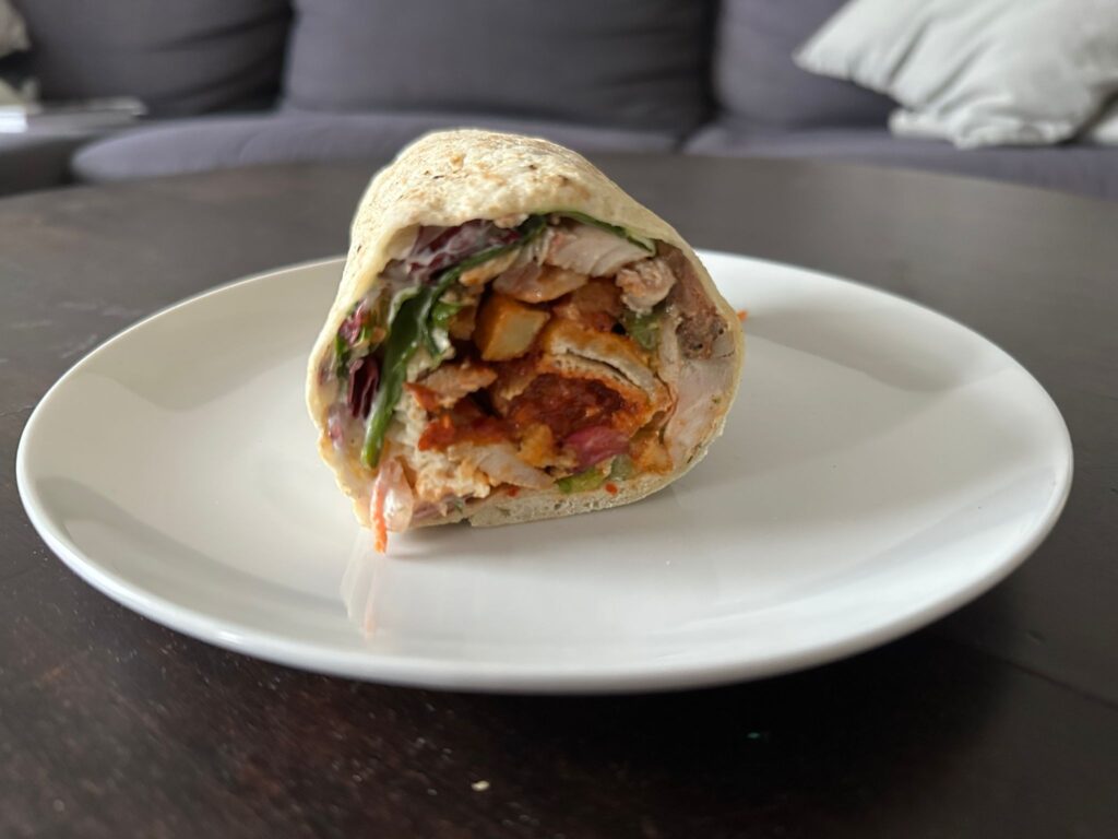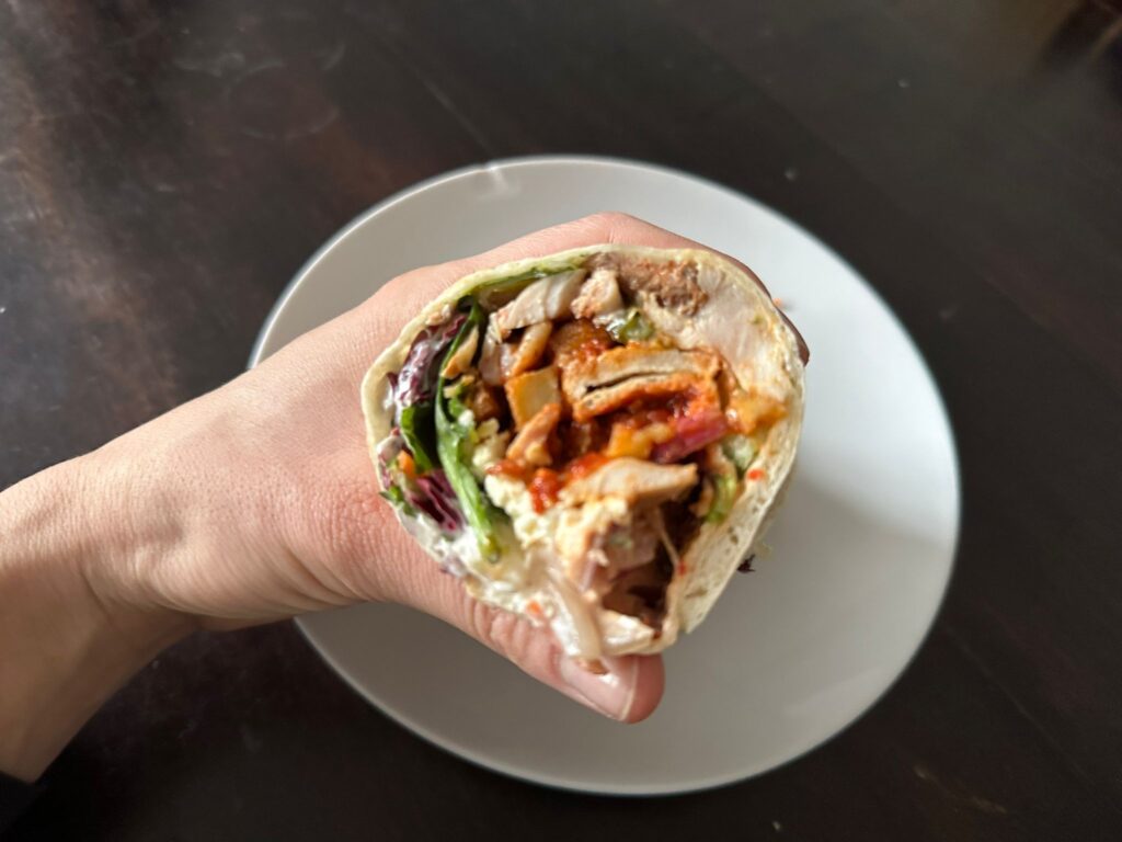 Na zeleninu přijde kuřecí maso a halloumi. Pak už gyros zarolujte. Nejlíp drží, když ho rolujete jako burrito, tedy nejdřív založíte strany jakoby dovnitř a pak až rolujete podélně celou placku. Dobrou chuť!