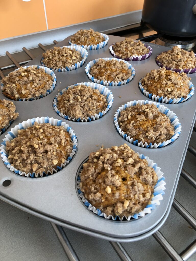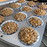 Formu na muffiny vyložíme papírovými košíčky, naplníme připraveným těstem a posypeme ořechovou drobenkou.
