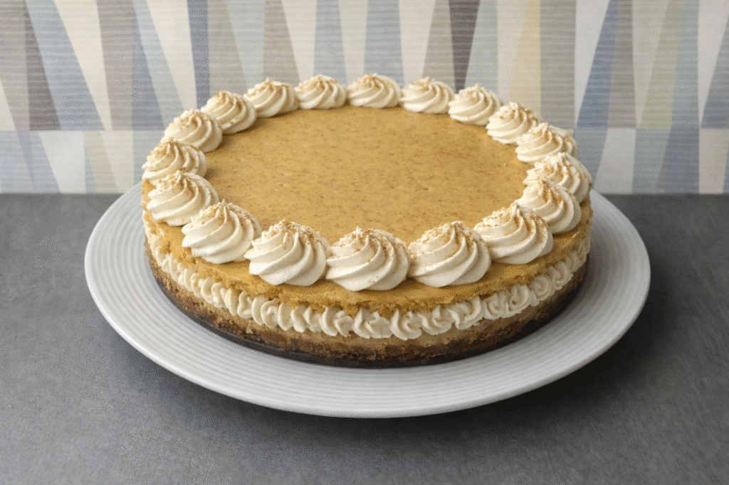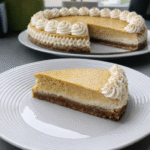 Druhou polovinu sýrové směsi smícháme s dýňovým pyré, kořením a třtinovým cukrem. Lžící opatrně dáváme dýňovou směs na sýrovou a uhladíme do roviny.