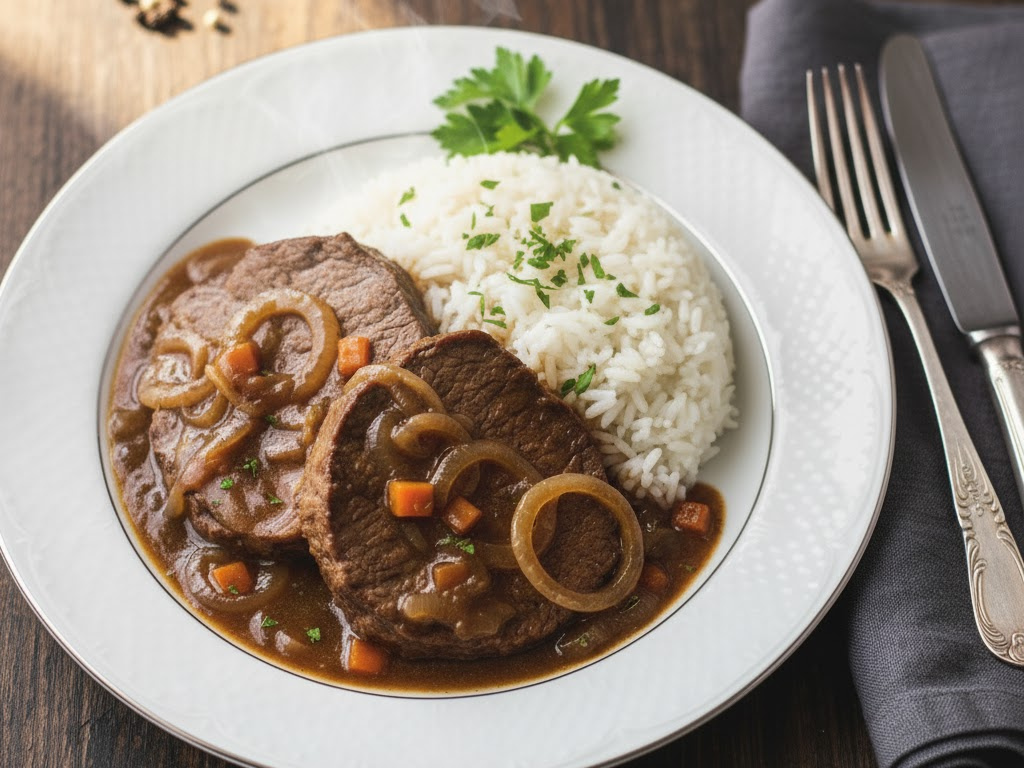 Podávejte klasickou roštěnou s čerstvými plátky masa přelitými bohatou cibulovou omáčkou. Tradiční přílohou je rýže, houskový knedlík nebo vařené brambory. Přejeme dobrou chuť!