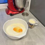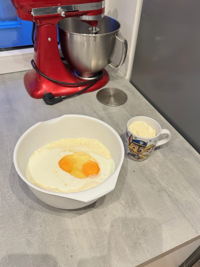 Do misky s drobenkou přidáme jedlou sodu, prášek do pečiva, kefír a vajíčka a vše prošleháme do hladka.