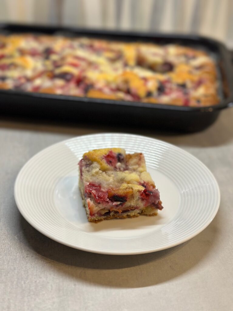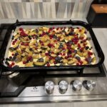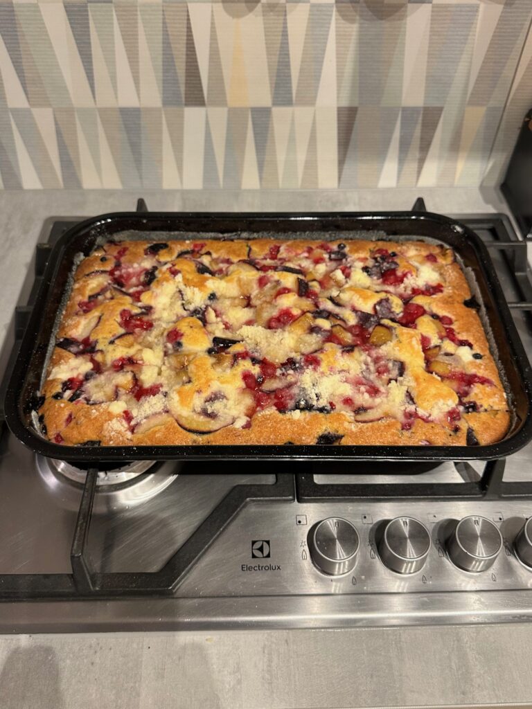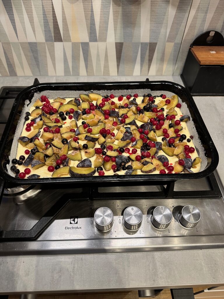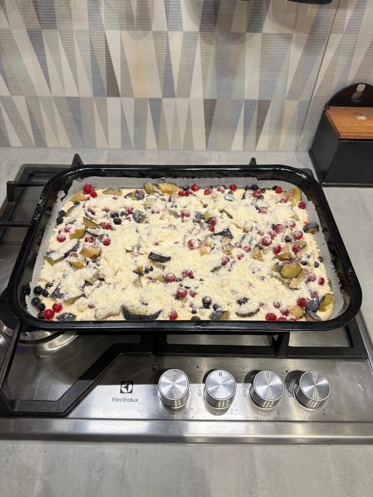 Plech vymažeme máslem a vysypeme hrubou moukou. Do takto připraveného plechu nalijeme těsto, poklademe ovoce a posypeme drobenkou.