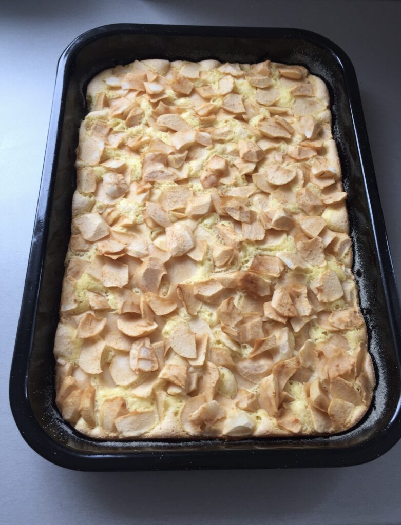 Plech vystříkáme olejem a vysypeme hrubou moukou. Nalijeme těsto a na něj dáme jablko pokrájené na kousky.