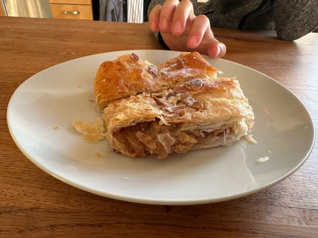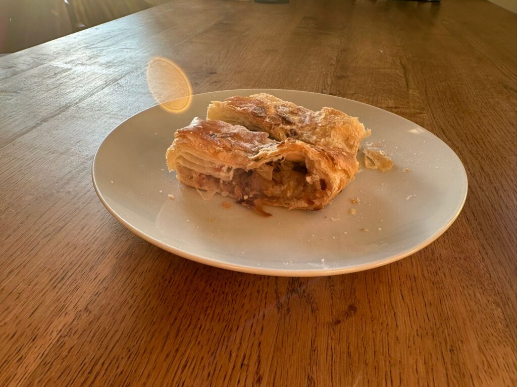 Listové těsto rozprostřeme na pomoučněný vál, případně na pečicím papíru, pokud jste jej koupili už zarolované v papíru. Doprostřed naneseme jablečnou směs a jablečný štrůdl opatrně zarolujeme, neboli zavineme. Spoj potom uhladíme navlhčeným prstem.