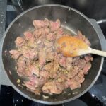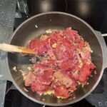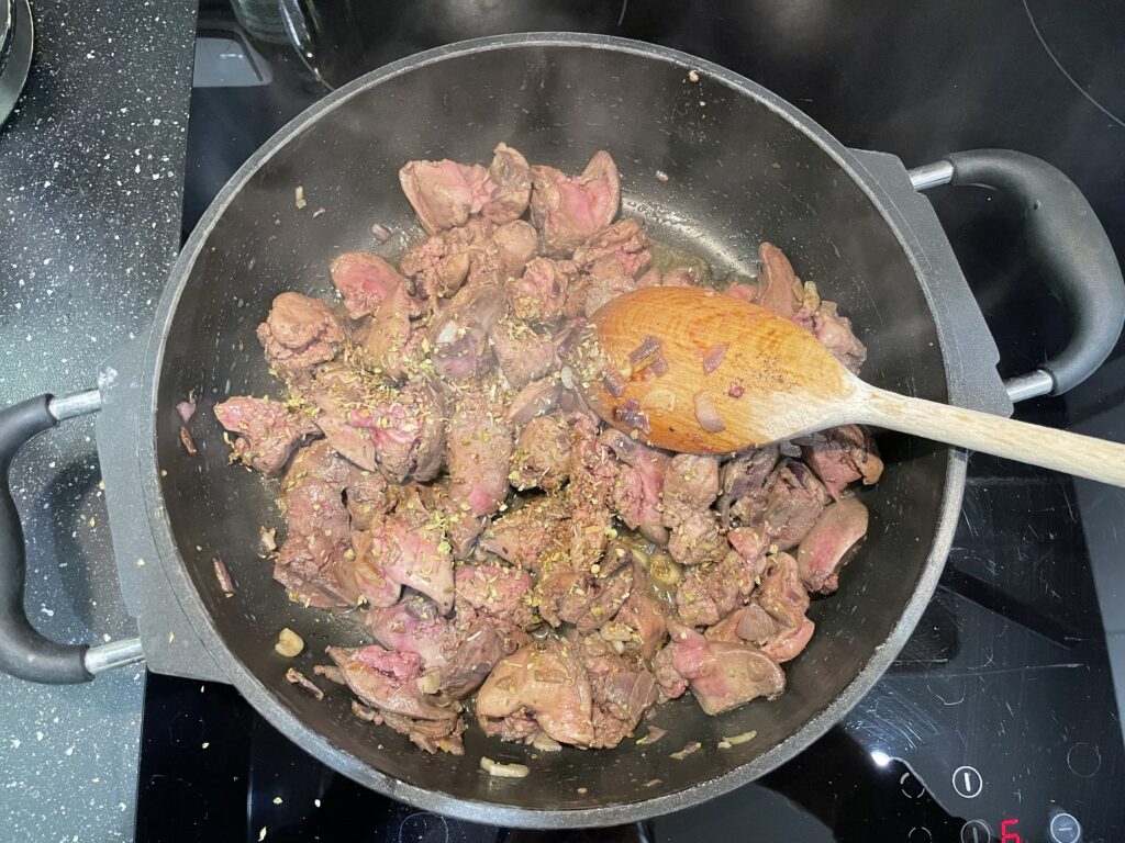 Na olej dáme restovat cibulku. Když je cibule zpěněná, přidáme játra a restujeme. Až jsou játra orestovaná ze všech stran, přidáme česnek.