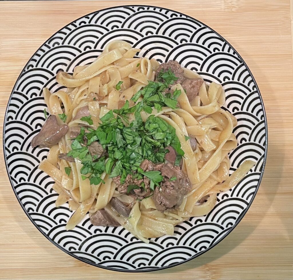 Nakonec játra smícháme s nudlemi uvařenými podle návodu na obale na al dente. Posypeme nasekanou petrželí.