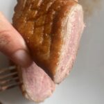 Pokračujeme kachními prsy. Ta odblaníme, osušíme a kůži nařežeme ostrým nožem tak, aby vznikla mřížka. Řez musí být dostatečně silný, aby kůži přořízl, ale ideálně aby ji nepřořízl úplně až do masa. Toto se nám bude lépe dělat, když budou kachní prsa z lednice. Před tepelnou úpravou je ale dobré je nechat chvíli temperovat v pokojové teplotě.
