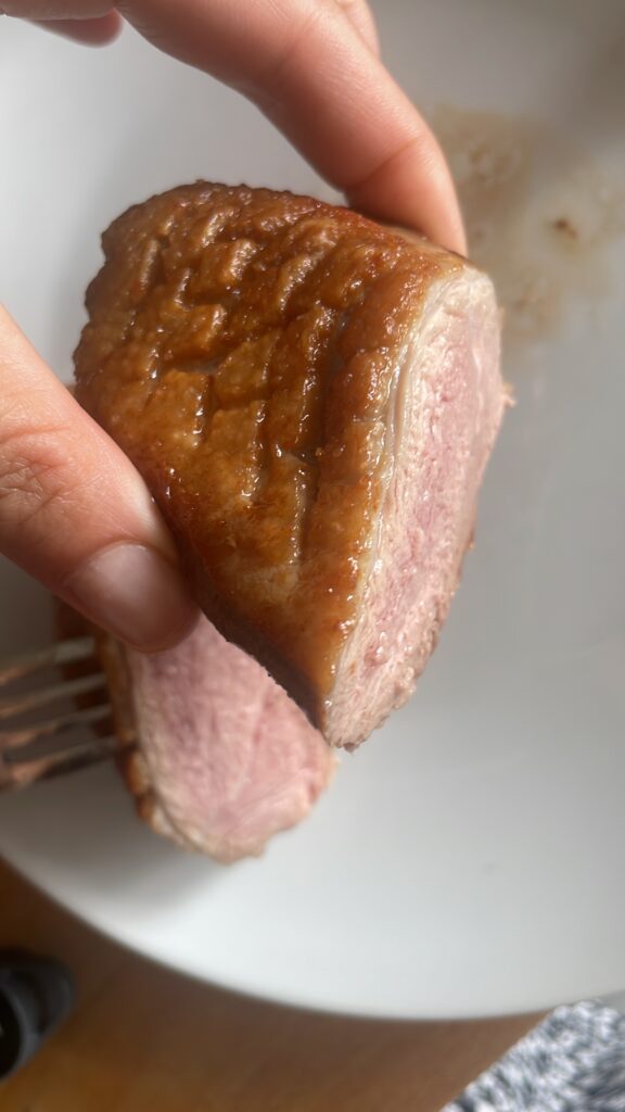 Kachní prsa potom otočíme a opékáme z druhé strany. Opečeme i strany a to tak, že si prsa podržíme pinzetou. Ideálně tak, abychom je nepropíchli. Vnitřní teplota by měla být okolo 57 stupňů, což kontrolujeme teploměrem. Jde to i bez něj, ale bude těžší trefit ten správný okamžik, kdy je kachní prso tak akorát. Na povrchu opečené a uvnitř hotové, ale růžové. Pokud nemáte teploměr, orientačně byste měli kůží dolů opékat okolo šesti minut a z druhé strany pak poloviční čas.