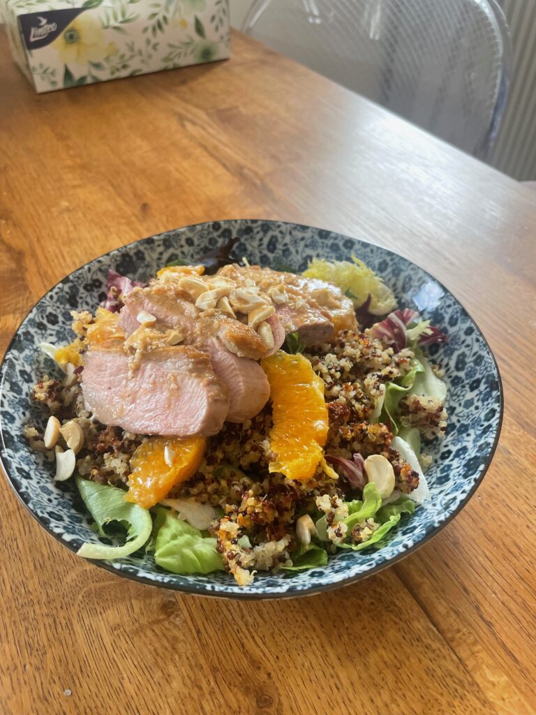 Mezitím, co prsa odpočívají, si připravíme salát. Ten ochutíme oliváčem, solí a pepřem. Dále na něj naaranžujeme pomerančová filátka, quinou a nožem podrcené kešu. Jestli chceme pokrm dát o level výš, můžeme quinou i kešu opražit na pánvi.