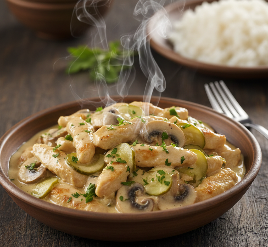 Kuřecí stroganov podávejte posypaný čerstvou petrželkou s rýží nebo těstovinami.