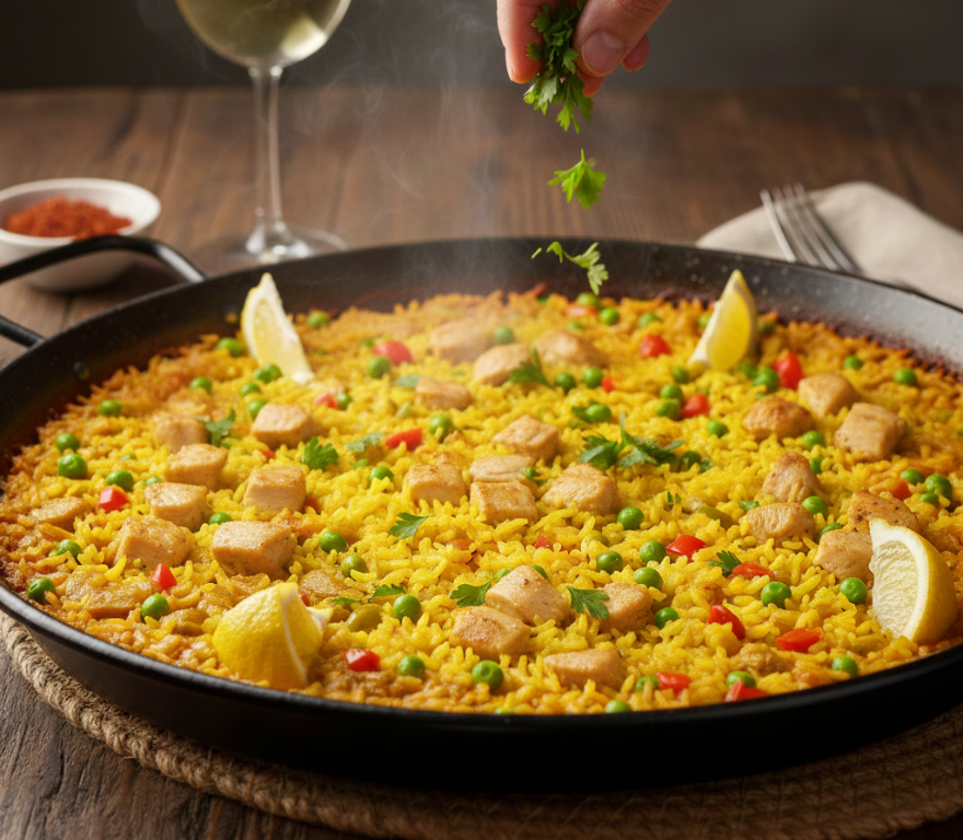 Ke konci vaření plamen ztlumíme a necháme paellu dojít, aby se na dně vytvořila typická lehce připečená křupavá vrstva rýže (socarrat). Pánev v této fázi už nemícháme, jen ji můžeme občas pootočit nebo posunout, aby se propekla rovnoměrně.