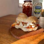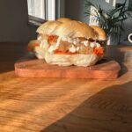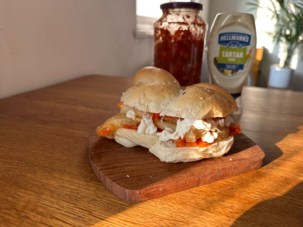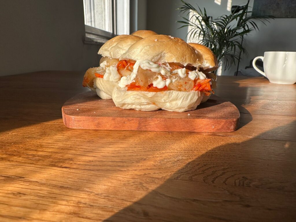Housku rozkrojíme a můžeme (ale nemusíme) ji opéct na pánvi. Tentokrát jsem měla úplně čerstvou, tak jsem ji neopékala. Na housku dejte štědré množství tatarky a pak směs teplých syrečků a kimchi. Přiklopte druhou půlkou housky a vychutnávejte.
