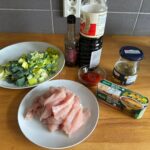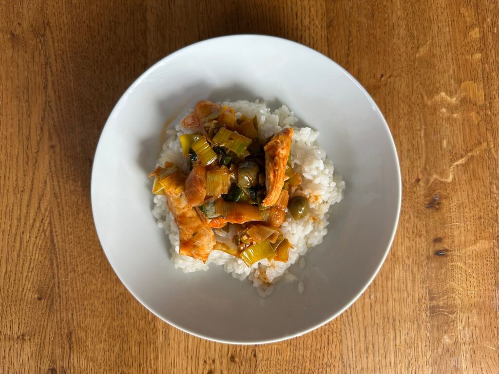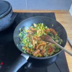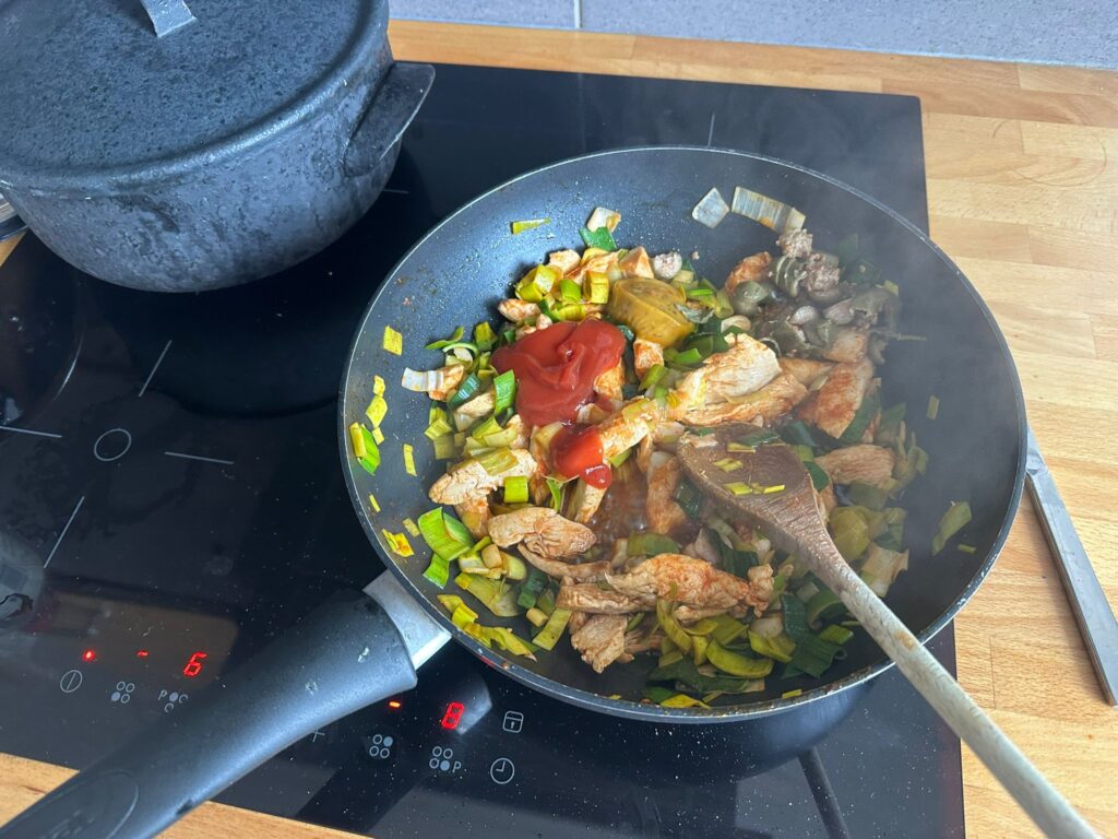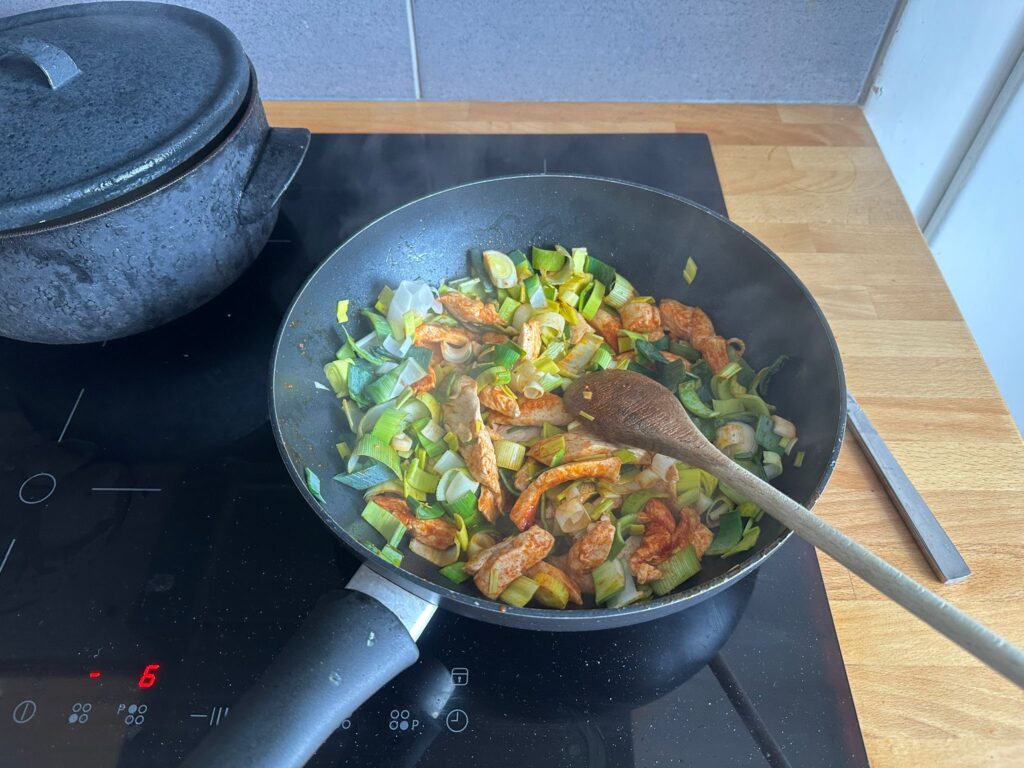 Na oleji opečeme nudličky kuřecích prsou, osolíme a zaprášíme je mletou paprikou. Podle toho, jak máte rádi pálivé, upravte poměr sladké a pálivé papriky. Pokud jste milovníci pálivého, klidně přidejte i trochu chilli. Když je kuře osmahlé, přihodíme pórek a krátce zarestujeme.