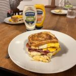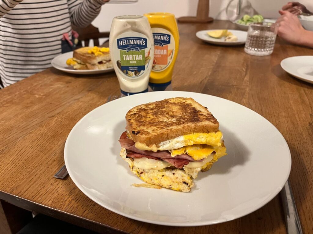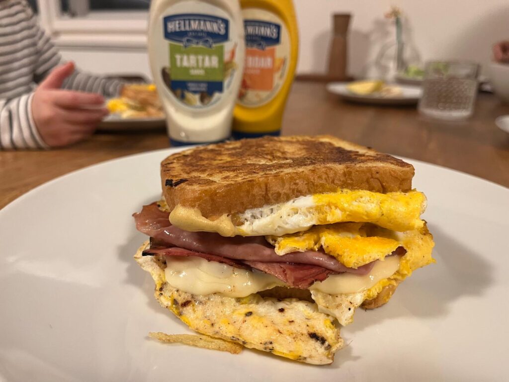 V mističce si rozšleháme vejce, osolíme a opepříme. Na pánev na trochu másla nebo oleje vylijeme vaječnou směs. Na ní položíme dva plátky toasťáku. Chvilku počkáme, až se vajíčka udělají, a pak chléb otočíme.