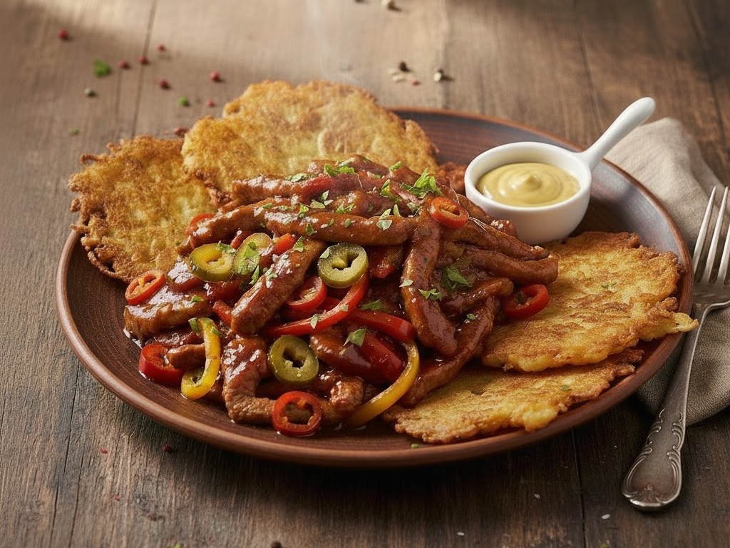 Katův šleh se tradičně podává s křupavými bramboráky. Stejně skvěle chutná s dušenou rýží.