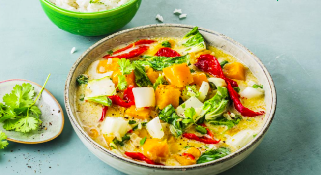 V 500 ml horké vody si rozpustíme bujón a spolu s kokosovým mlékem vlijeme do pánve. Omáčku ještě necháme pár minut zredukovat na mírném ohni.